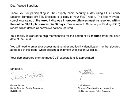 創思維驗廠沒有辜負工廠領導的信任,以快速、有效的驗廠方法與手段一次性順利通過UL 驗廠,一舉拿下VCS訂單,客戶滿意的寫下下列郵件: