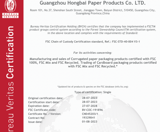 在創(chuàng)思維驗廠網老師專業(yè)技術、全程跟進耐心細致輔導以及公司全體員工配合下,一次性順利通過BV- FSC認證,為將來公司發(fā)展奠定了良好的發(fā)展基礎,既開拓了市場同時也增加了消費者對公司的信賴,在這里再次祝賀廣州宏柏印刷包裝有限公司2023年一次性成功通過BV- FSC認證,同時也期待未來再次與創(chuàng)思維驗廠網合作!